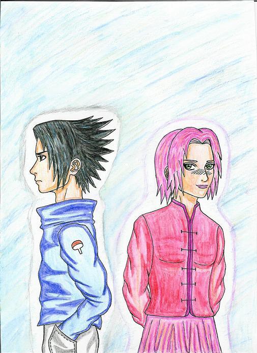 Un dessin sur lequel j'ai passé pas mal de temps, mais qui n'est pas très réussi pour autant T_T Le visage de Sakura me plait moyennement et puis son total-look-rose est pas forcément top... Quand à Sasuke, au départ je voulais lui faire les bras croisés ms j'y arrivais pas du coup je lui ait fait les mains ds les poches ms je ne crois pas que ce soit plus réussi XD, sinon il a peut être les yeux trop petits et puis je crois qu'il a la tête légèrement trop en arrière... Matériel : critérium, gomme, stylo noir, crayons aquarellables, pinceau à réservoir. Plus de Fanarts de: Haruno Sakura, Uchiwa Sasuke |