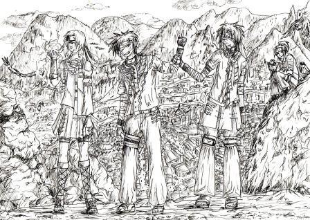 Brouillon au crayon, repassé à l'encre noire. J'avais envie de créer ma propre équipe, et comme j'adore les oiseaux...ils font forcément partis d'un village inventé, Taka no Kuni(dsl j'ai pas trouvé mieux comme nom^^) Et tant qu'a faire, inventons un clan aussi: Le clan des Otori(désolée je vole le nom d'un bouquin (lisez-le c'est super)mais c'est juste pour mon fanart...(pis je me rattrape en faisant de la pub:p) Bon j'espère que le décor vous plais (ya interêt!!:p) |
